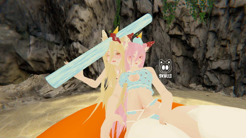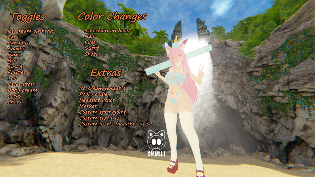 Ice cream on head, Melted ice cream on ears and chest, Cat sprinkles pasties,Tail, Cat thigh highs, Eye textures, Cherry earrings, Ice cream cat holdable, Ice cream nails, Choker, Beach ball springjoint, Pool noodle